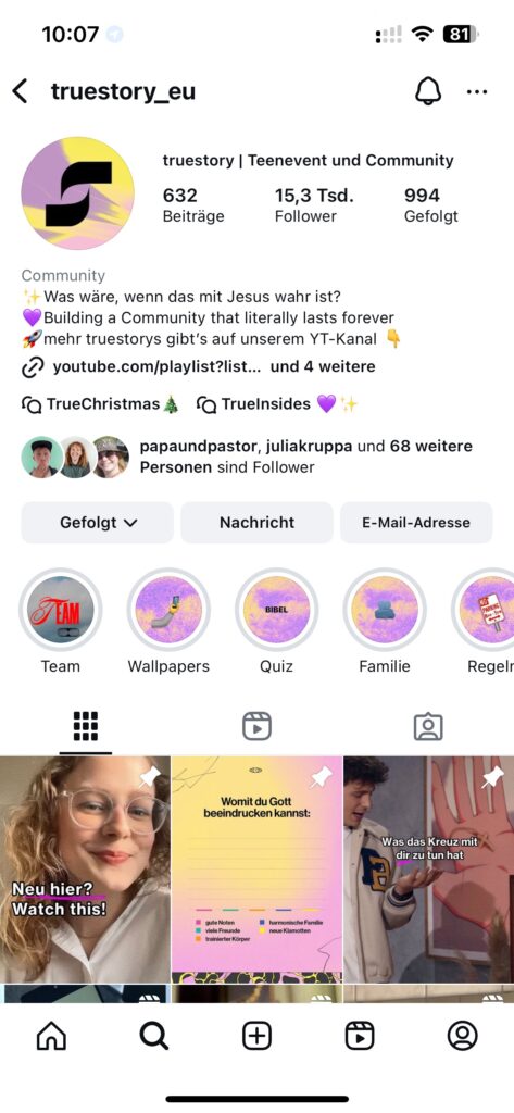 Für truestory 2026 stehen wir vor der Aufgabe, glaubensferne Jugendliche für die truestory Nights zu mobilisieren und sie einzuladen. Denn wir möchten unsere Reichweite nutzen, damit Jugendliche Jesus nicht nur digital begegnen, sondern auch vor Ort.